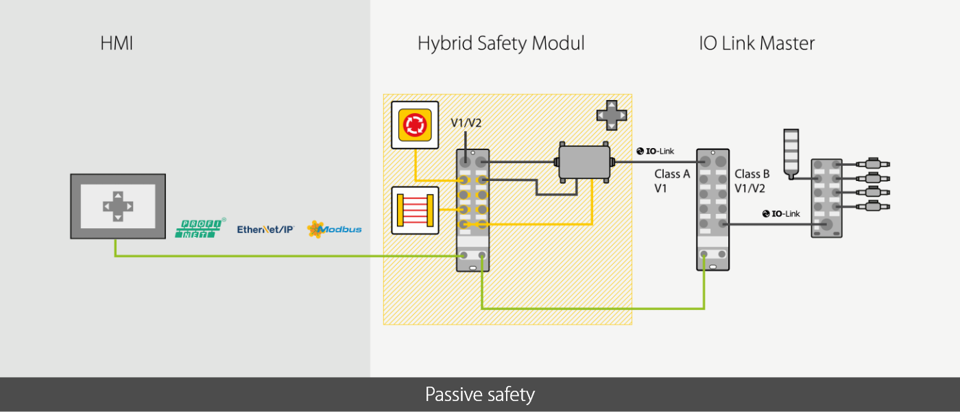 Scenario 3: Cablaggio decentralizzato — controllo centralizzatoIl concetto decentralizzato con sicurezza passiva si basa sull'isolamento galvanico coerente tra la tensione dell'attuatore e quella del sensore. In caso di emergenza, la tensione dell'attuatore può essere disinserita in modo sicuro mentre il sistema di sensori rimane attivo. Vantaggi: il numero minimo di ingressi di sicurezza consente di risparmiare sui costi e la diagnostica rimane possibile nonostante un arresto di emergenza.
