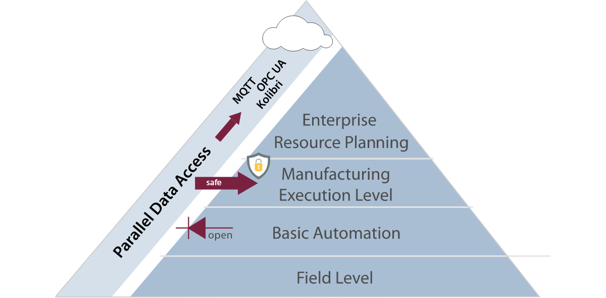 Questi funzionano in parallelo sulla stessa rete. Il sistema IT per l'analisi dei dati dispone dell'autorizzazione di sola lettura. Ciò impedisce la manomissione del processo o del sistema di controllo. I sistemi per l'analisi dei dati possono essere realizzati in locale senza una connessione di rete esterna o in sistemi cloud.