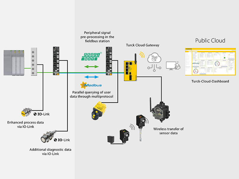 Il condition monitoring 24 ore su 24, 7 giorni su 7 e da qualsiasi dispositivo remoto, configurazione di dashboard personalizzate, ricezione automatica di informazioni sui valori critici: è possibile fare tutto questo e altro con le soluzioni cloud Turck. Il gateway cloud TCG20 crittografa i dati e li invia al cloud Turck o a servizi online come Amazon Web Services o Microsoft Azure. In alternativa, il cloud Turck può anche essere ospitato direttamente sul server di un'azienda (locale).